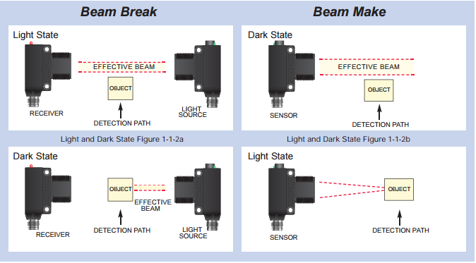 For an object to be detected, it must affect the intensity of the light beam reaching the sensor’s light detector in one of two ways: