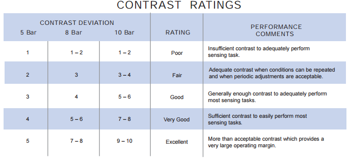 Contrast signal deviation charts are available on all sensors equipped with the Contrast Indicator. These charts are extremely helpful in determining if the sensor you have selected will adequately perform your particular sensing task at the desired range. Simply reference the amount of contrast deviation required to perform the sensing task in your environment, and compare it to the performance chart of the sensor you have selected to determine if the sensing range is adequate.
