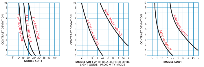 These charts are extremely helpful in determining if the SMARTEYE® you selected will adequately perform the sensing task at the desired range. Simply reference the amount of contrast deviation required to perform the sensing task in your environment and compare it to the performance chart of the SMARTEYE® you have selected to determine if the sensing range is adequate. Shown below are typical performance charts on (3) Model SD SMARTEYE® Sensors.
