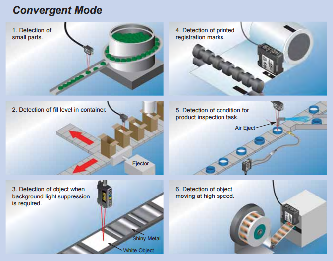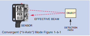 The convergent mode of Beam makes sense and is very similar to the proximity mode. The convergent beam sensor, like the proximity sensor, responds to a light beam path that reflects off the surface of the object. However, the lensing system of a convergent (also referred to as “V-Axis”) sensor converges the light beam into a small spot of light at a distance of a few inches, precisely at the receiving lens focal point. Using this technique provides an effective method of enhancing background suppression, while directing, by reflection, a very strong light beam on a direct path to the receiving lens. In addition to improving background suppression, convergent sensing is very useful for small parts detection and for the detection of printed identification data.