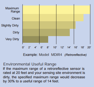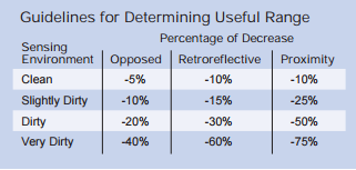 However, these maximum sensing range specifications are for reference only. That is because these range specifications are taken under ideal conditions, with clear lenses, and in very clean environments. These conditions are not found in the vast majority of industrial applications.