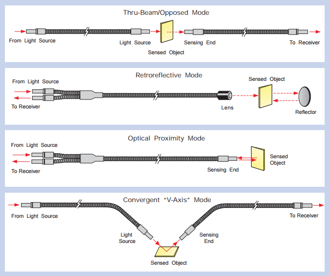 Fiberoptic light guides can also be used in a convergent mode for “V-Axis” sensing. Simply direct two fibers at the target in a “V” configuration and small parts or the contrasts of an object can be detected.