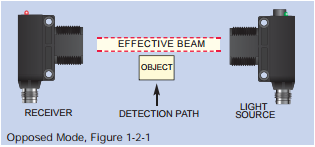 In this mode, the light source transmits a beam of light across the detection path to the receiver. Detection occurs when an object interrupts or sufficiently diminishes, the intensity of the received light beam (see Figure 1-2-1).