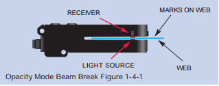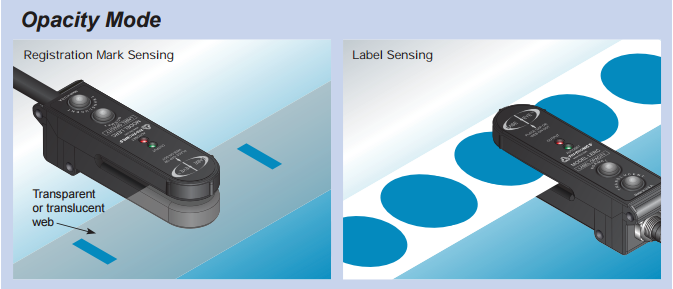 A significant advantage of opacity mode sensing with TRI-TRONICS® gap sensors is that end-users do not need to be concerned with web flutter or ambient light, including strobe flashes. Depending on what you are trying to sense, opacity mode sensors can give you the desired output signal to perform machine functions. Typical applications include sensing labels on a roll, sensing registration marks on printed packaging material, and splice detection on continuous webs of material. Since opacity mode sensing distinguishes the light level change as light passes through a web of material, the web must be translucent or transparent. Most webs of packaging material such as film, metalized films, and paper do allow light to pass through. Opaque materials such as aluminum foil do not allow light to pass through and, therefore, cannot be used in opacity mode sensing.