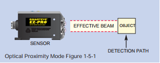 Optical Proximity sensors contain both the light source and the receiver in one common housing. The light source lens shapes the light beam into a diverging column of light that, with distance, increases in width and decreases in intensity. A wide-angle receiving lens is used to collect the reflected light beam off the surface of the object to be detected (see Figure 1-5-1).