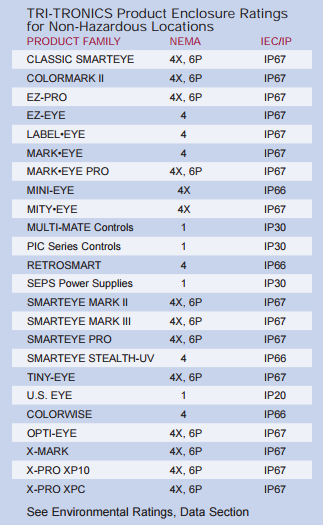 When selecting the appropriate TRI-TRONICS® sensor to fit your application, sensing site environmental conditions should always be considered. All TRI-TRONICS® products are designed with enclosures or housings that provide varying degrees of protection against special environmental conditions. The accompanying table lists the NEMA and IEC/IP Standards that apply to individual TRI-TRONICS® sensors and control enclosures.
