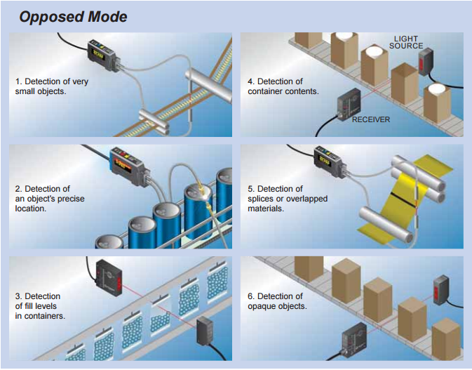 In the Opposed Mode of sensing, two separate devices utilizing either lensed or fiberoptic light guides are used to make or break a beam.
